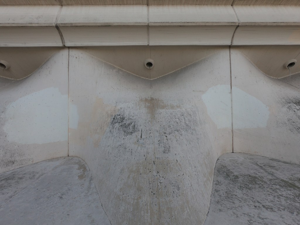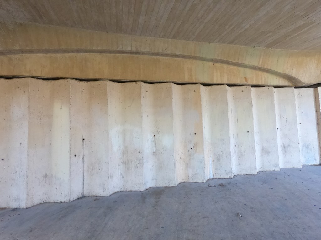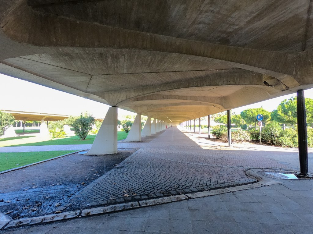 Los bajos de los tableros, diseñados también para cumplir una destacada función estética, se conforman sobre una trama de arcos escarzanos de hormigón, de geometría variable, con trazado manual, replanteados por cotas, con una disposición en zigzag, que conectan una viga continua, de hormigón armado, de gran canto, en el extremo exterior de cada tablero sustentada en dieciocho finos pilares de hierro, simplemente apoyados, como bielas, que confieren una sensación de gran ligereza, separando sus diecinueve vanos y en el extremo interior están apoyados los tableros en diecinueve pilares de hormigón, de alzado diagonal, a modo de tajamares, que como si fueran contrafuertes, reciben la carga de los arcos.
