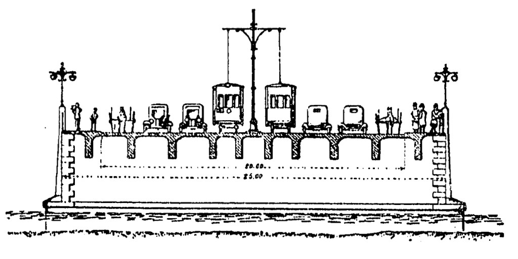 El puente estaba diseñado, en su sección transversal, con una plataforma central para tranvía y ferrocarril de vía estrecha (el popular trenet) de 5,4m de ancho, dos zonas laterales con 3 vías para carros o automóviles, de 7,3m de ancho cada una y dos aceras en los extremos del puente de 2,5m de ancho cada una, ancho total, 25m.