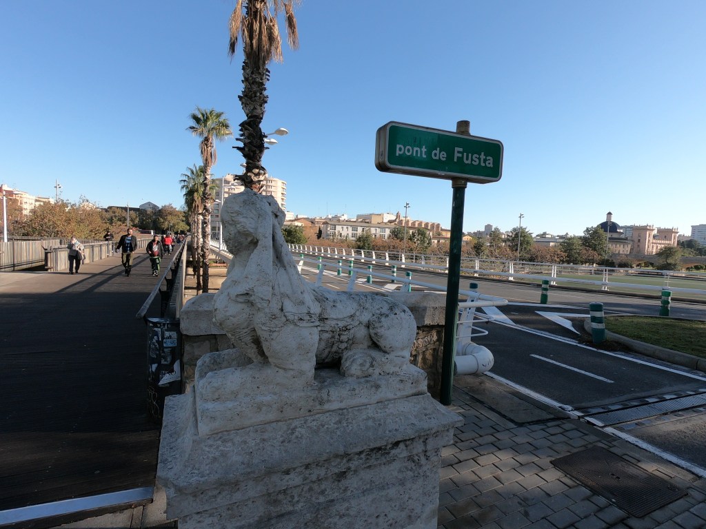 En el Puente de Madera, en la entrada a la pasarela peatonal, están enclavadas dos estatuas de piedra, colocadas una frente a la otra, sobre un alto pedestal, de autor desconocido, fechadas hacia 1838, que representan a una mujer con velo y con cuerpo de león, llevando una cinta en torno al cuello, flores en el pelo, estando las cabezas tocadas por un velo que les cae sobre los hombros. Se encuentran ambas estatuas en un mal estado de conservación.