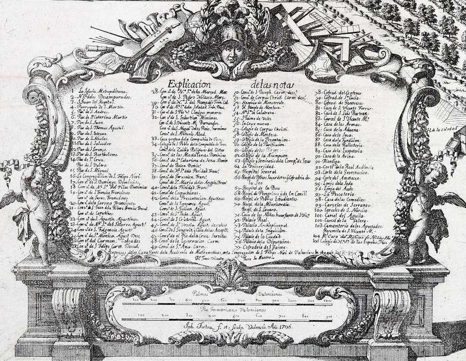 Hay un último detalle que permite precisar con exactitud la fecha del grabado de Fortea y es la aparición en la cartela explicativa, con el número 105, del Colegio de las Escuelas Pías. Se observa en el plano de Fortea la espadaña del edificio del Colegio de los Escolapios, que no se observa en el plano original. Los Escolapios llegaron a Valencia en 1736, iniciando la docencia en la casa en la que se instalaron, el 20 de diciembre de 1737, por lo que es factible conjeturar que el plano de Fortea sea de 1738.