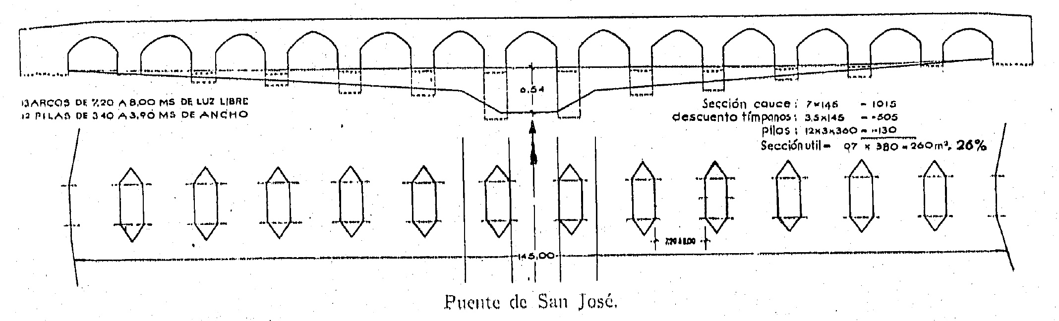 Para ello estimó cuál era la superficie útil de desagüe de los puentes dentro del viaje cauce, determinando, mediante cálculos, que la superficie útil de desagüe de los puentes, era, en el mejor de los casos, inferior al 40%, como se puede ver en las imágenes adjuntas.