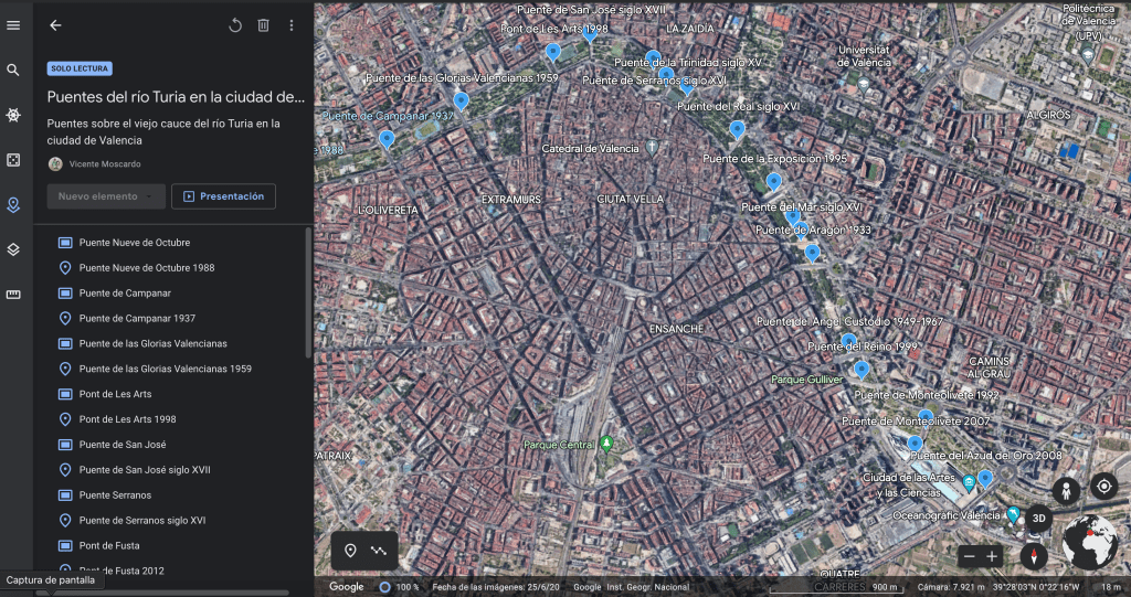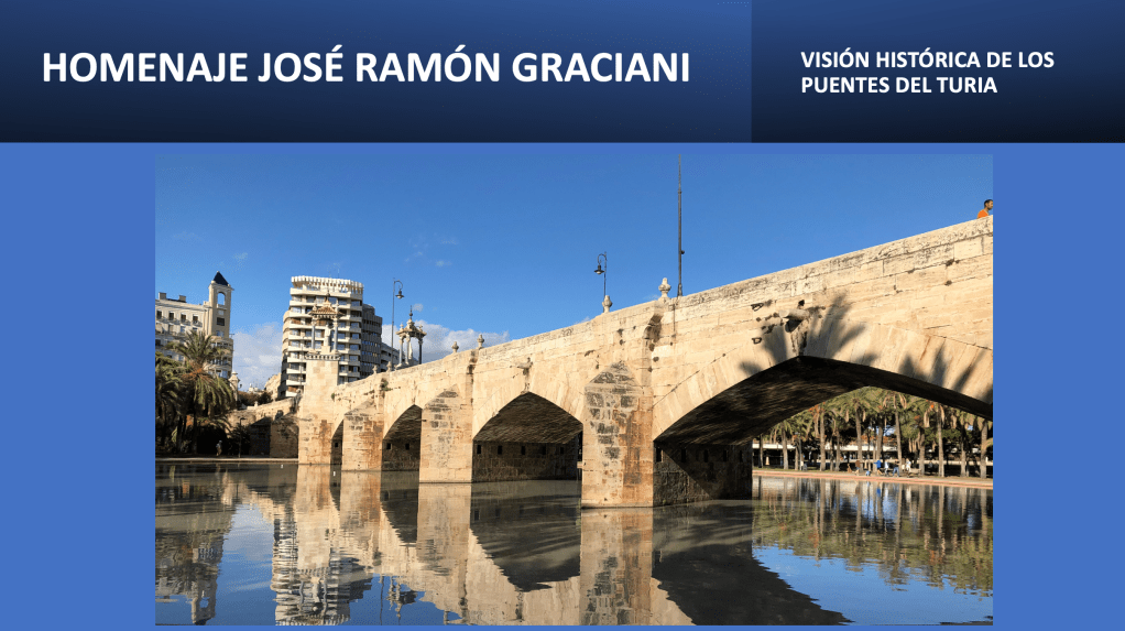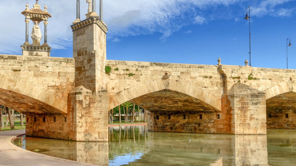 El viejo cauce del río Turia es hoy en día conocido como el Jardín del Turia, siendo el parque longitudinal urbano mayor de Europa, ofreciendo distintas áreas ajardinadas, zonas deportivas, recreativas, carriles bici, siendo uno de los principales atractivos de la ciudad, utilizado a diario por miles de habitantes y visitantes de nuestra ciudad. A lo largo de sus casi 10 km. nos encontramos con los 19 puentes que permiten acceder en distintas zonas de la ciudad desde la margen derecha a la margen izquierda. Desde aguas arriba, al oeste de la ciudad, hacia aguas abajo, al este de la ciudad, encontramos los siguientes puentes: